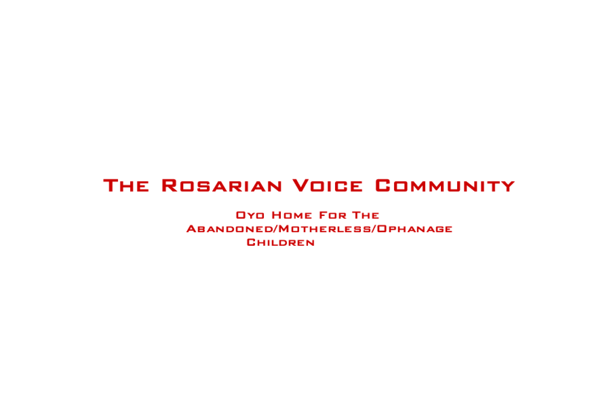 Rosarian voice community is a divine charity organization approved by the Governor of Oyo State (copy available) and registered in Nigeria for proper monitoring, caring, socialization, education, and maintenance of abandoned/less privileged Children in Nigeria. It is a child welfare movement, and it is designed for shaping their destines and improving their living conditions (by creating a conducive settlement for them).
